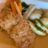 Gebakken zalmfilet met witte wijn saus. Met groenten- en aardappelgarnituur